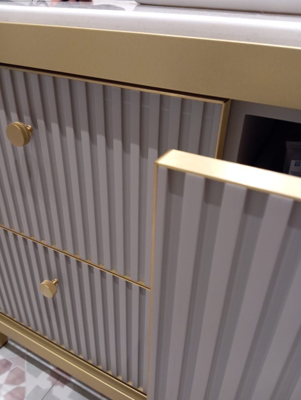 Фасады тумбы украшены вертикальными полосами, которые добавляют динамики и подчеркивают современный стиль. Ящики с доводчиками открываются и закрываются плавно, как будто по волшебству, продлевая жизнь механизма и даря удовольствие от использования. Латунные вставки на ящиках словно маленькие драгоценности, которые придают изделию изысканность и подчеркивают его уникальность.